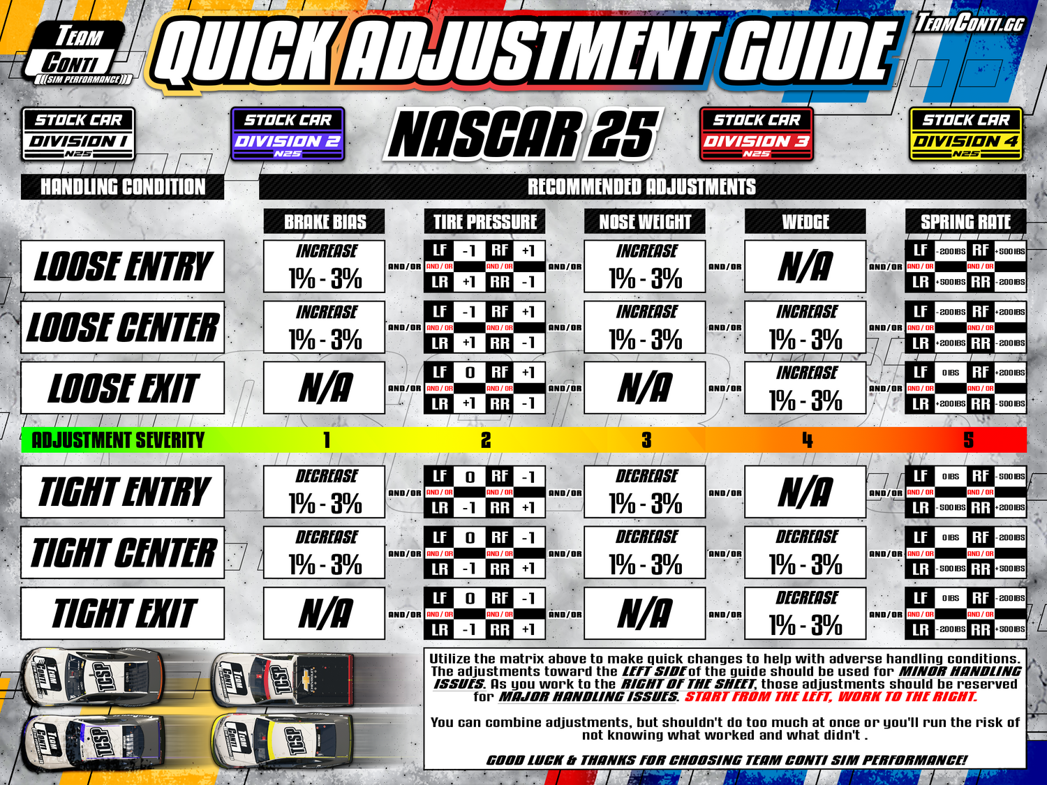 TCSP's Quick Adjustment Guide for NASCAR 25 has you covered.