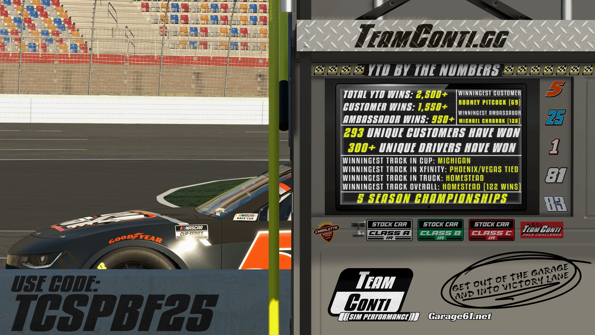 Get out of the garage and into victory lane with TCSP, your one stop shop for iRacing and NASCAR 25 setups, coaching, & more!